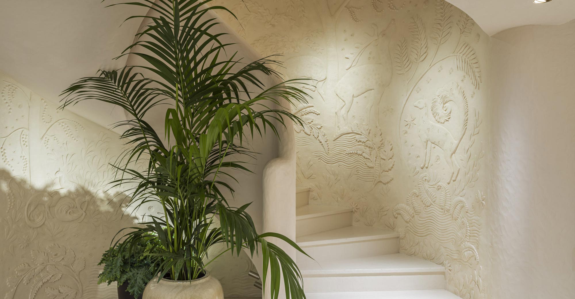Decorated by a carved fresco inspired by Jeanne Lanvin’s bathroom designed by Armand Albert Rateau, it depicts a luxuriant and imaginary fauna and flora. Birds are a constant feature at Jeanne Lanvin and the daisy prints are another element of the graphical identity of Lanvin linked to her daughter Marguerite whose name means daisy.