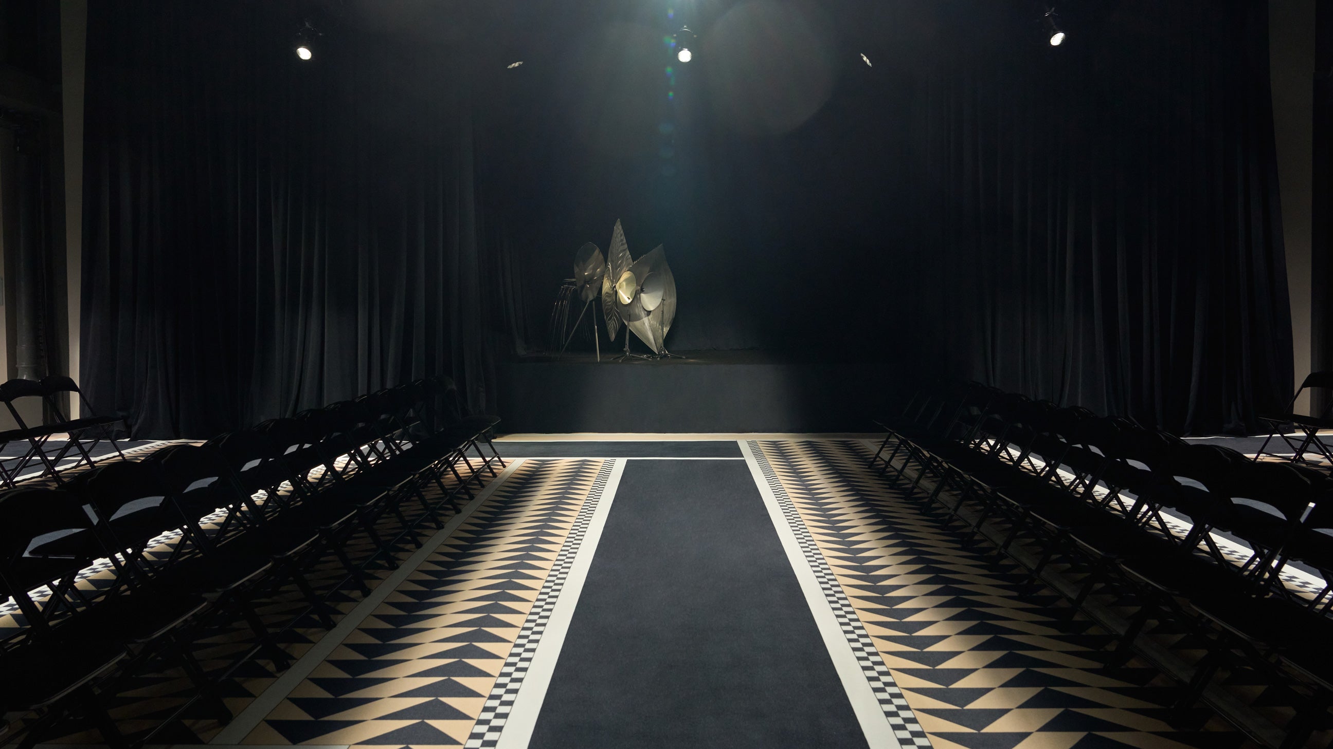 The intimate runway design is M/M Paris's reinterpretation of Jeanne Lanvin's iconic bathroom tiles designed by Armand Albert Rateau, anchoring the space in the brands historical legacy. During the show, a performance on the Cristal Baschet instrument by Marc Chouarain added an ethereal auditory layer to the conceptual sound design/show soundtrack by Frédéric Sanchez.